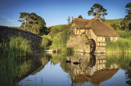Cette visite vous donnera l’impression d’être au beau milieu du film de Peter Jackson. Vous passerez devant les nombreuses maisons miniatures creusées dans les collines ondulantes, dont seules les entrées sont apparentes et réelles. Vous verrez également le fameux moulin, la taverne du Dragon Vert, le pont à deux arcs, l'arbre de fête et autres structures créées pour constituer le décor des films Le Seigneur des Anneaux et Le Hobbit. La visite se termine au « Green Dragon Inn », lieu de retrouvailles des habitants de Hobbiton, où vous pourrez contempler le lac, le moulin et la maison de Bilbo. Vous pourrez vous relaxer devant le feu de cheminée crépitant, un verre à la main. Votre visite se termine au bout de 2 heures au Shire’s Rest Cafe.