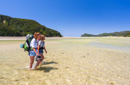 Option randonnée : randonnées de niveau facile le long du sentier pédestre Abel Tasman Coast Track. Accès, soit à pied depuis le parking, soit en bateau taxi depuis les plages le long du sentier, ou en kayak tout au long de la côte.