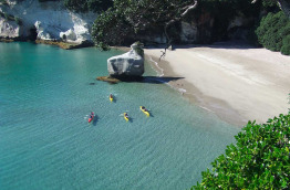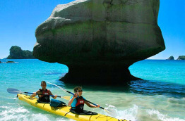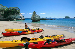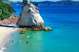 Rendez-vous à la plage de Hahei pour une excursion en kayak dans un cadre naturel d'une beauté exceptionnelle. Cette demi-journée est d'ailleurs considérée comme l'une des meilleures excursions dédiées à cette activité de Nouvelle-Zélande. La réserve marine de Te Whanganui-A-Hei (Cathedral Cove) constitue en effet un véritable paradis pour les pagayeurs, avec ses eaux limpides, sa multitude de plages de sable blanc, ses petites îles et ses jardins de rocaille. Il s'agit de la première réserve marine de la péninsule de Coromandel, rendue célèbre notamment par son arche naturelle creusée par l'Océan Pacifique. Munis de votre pagaie, vous explorerez des grottes marines creusées naturellement dans la roche par l'action des vagues. Vous aurez l'occasion d'observer la faune marine locale. Vous quitterez votre embarcation à Cathedral Cove pour savourer un cappuccino ou un chocolat chaud directement sur la plage, avant de rejoindre la plage de Hahei où votre excursion prend fin au bout de 3 heures. Transfert libre à votre hôtel.