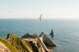 Vous marquerez un arrêt au sommet de la falaise avec une vue panoramique sur Hawke’s Bay et la péninsule de Mahia, située à l'extrémité Nord de la baie. L'occasion d'admirer le littoral accidenté de cette baie, abritant quelques merveilles naturelles et géologiques, avant d'atteindre les hautes falaises de Cape Kidnappers. C'est à cet endroit en 1769 qu'un Maori kidnappa un des membres de l'équipage du « Endeavour », mené par le Capitaine Cook. C'est de cet épisode de l'histoire que Cape Kidnappers tire son curieux nom. Vous effectuerez au total 36 km sous les commentaires de votre chauffeur-guide sur Cape Kidnappers et ses fameux fous de Bassan. À votre arrivée sur le site, un paysage grandiose se dévoile du bord de la falaise, surplombant l'océan de 100 m. Votre véhicule étant autorisé à s'approcher à quelques mètres seulement des fous de Bassan, vous pourrez observer ces majestueux oiseaux marins de très près dans leur habitat naturel, sans même avoir à descendre du véhicule. Retour au point de départ de l'excursion à Te Awanga au bout de 3 heures, transfert libre à votre hôtel.