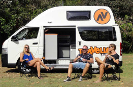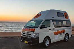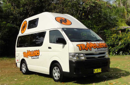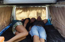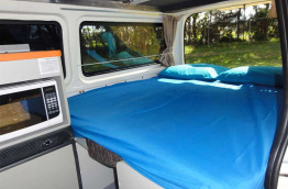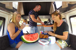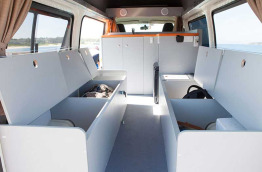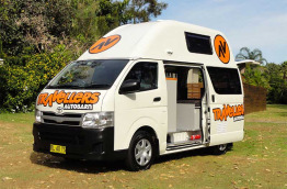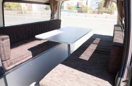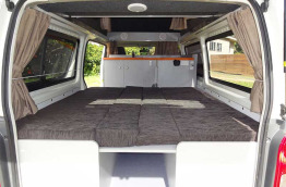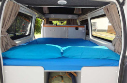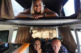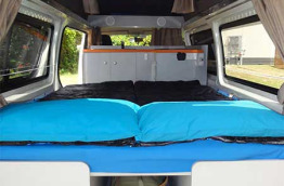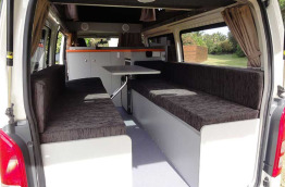 Le camping-car idéal pour 2 personnes et un enfant. Le Kuga Campervan, type Toyota Hiace permet d'accueillir 3 personnes avec ses 3 sièges à l'avant du véhicule et offre plus d'espace avec son toit fixe relevé : deux banquettes convertibles en un lit double et un lit individuel en hauteur.